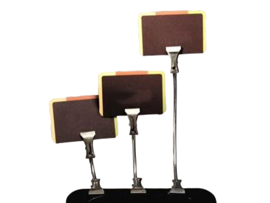 FoodSignPros' stainless-steel Flex Clip Series makes precision food signage easier than ever. Equipped with spring-loaded gator grips, Flex Clips securely attach to almost any surface and stay there. Flexible necks ensure pinpoint labeling in even the most acrobatic positions.